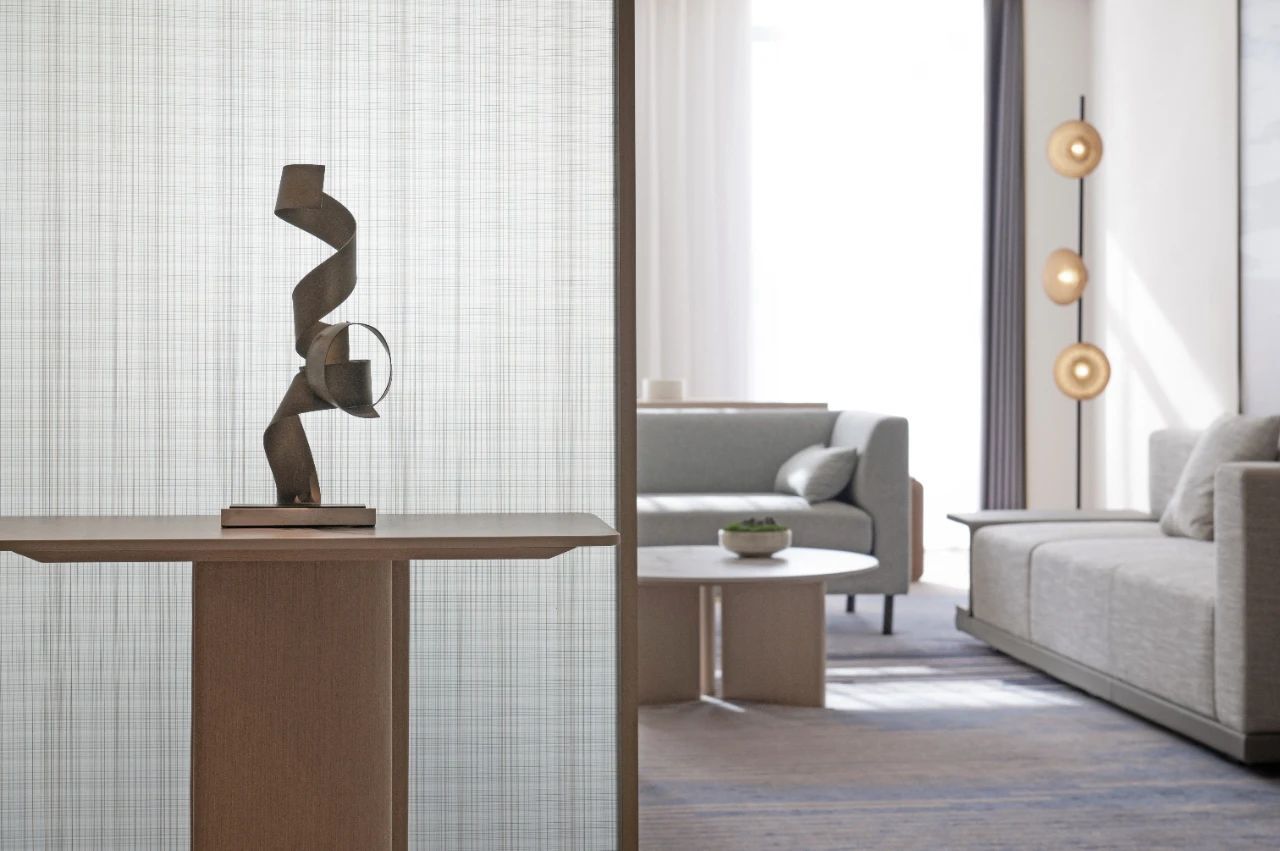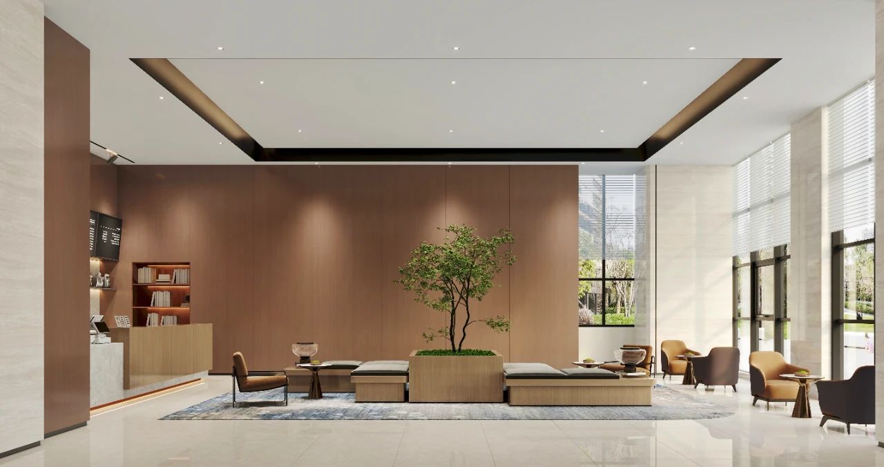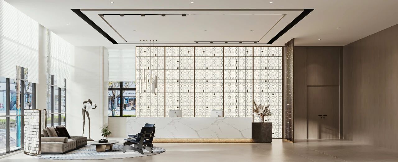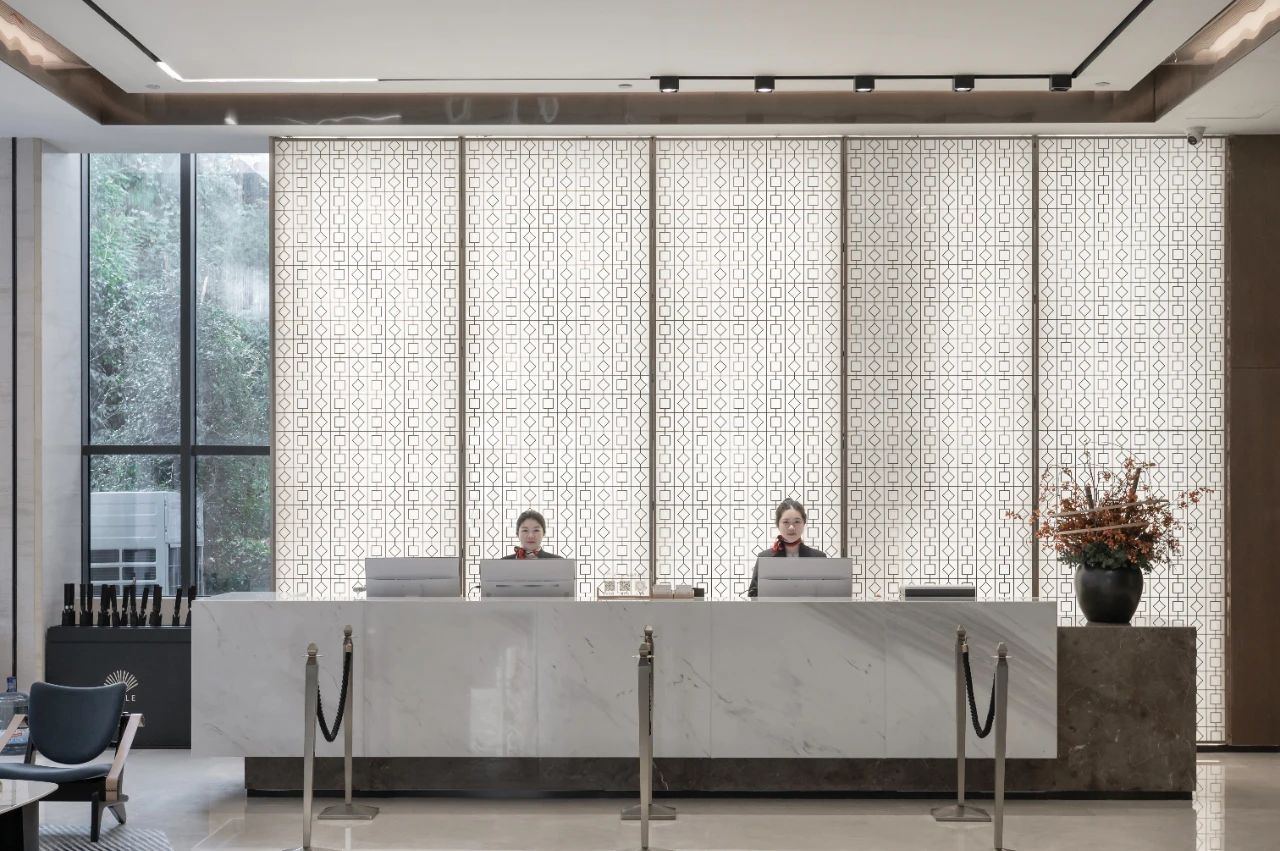 设计理念:首层大厅提供了一个理想的过渡空间,将客人带离繁忙的街道,并为他们开启美好的酒店体验。通过材质的搭配选择、企业色彩的选择,以及定制的金属背景墙形成名副其实的艺术之旅,从而探索在地与人文、自然与艺术、真实与想象之间的联系。