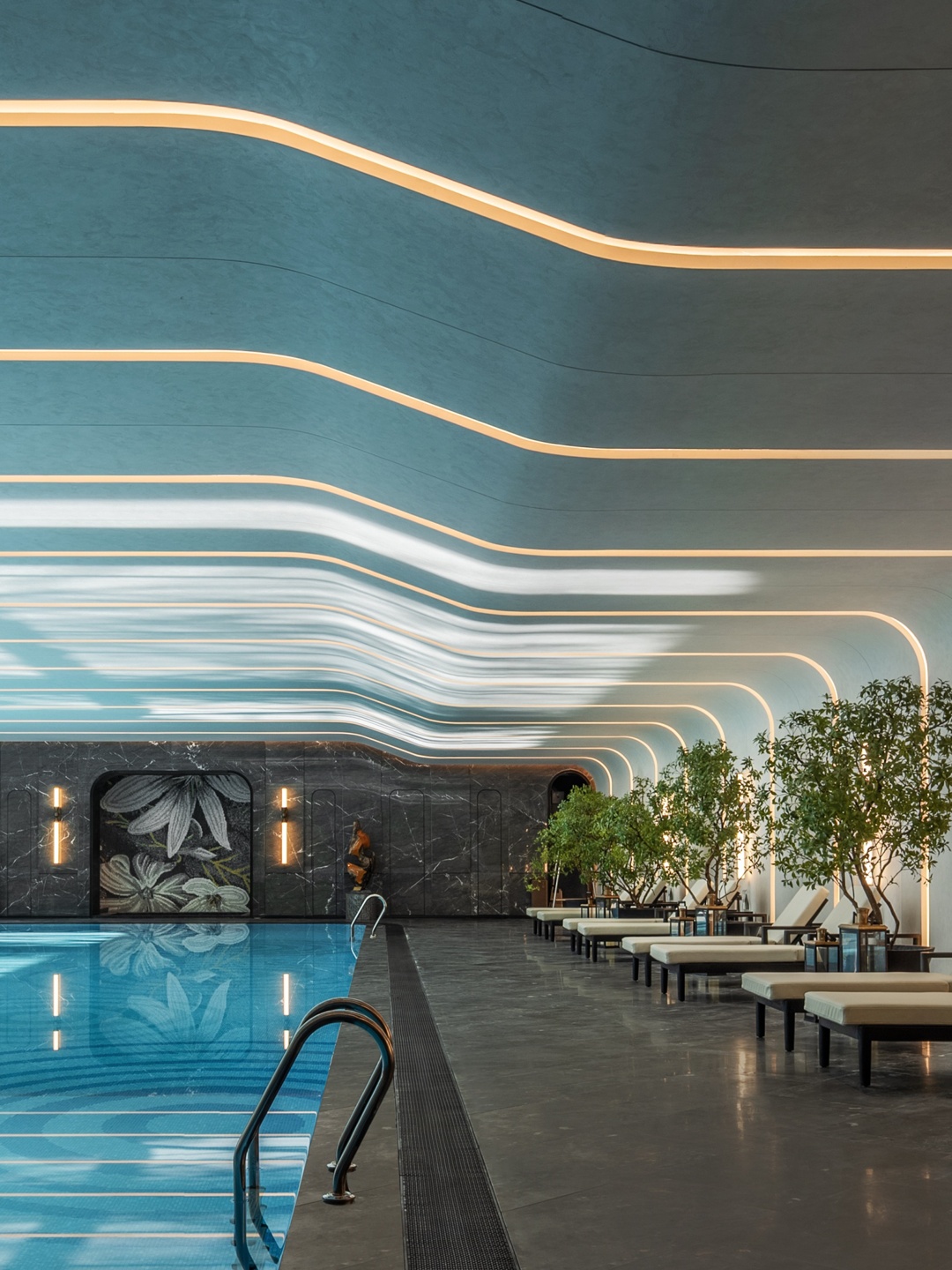 设计理念:项目位于合肥市滨湖新区,东南直面巢湖。深植于“三河归流”的水文基因,设计团队淬炼出“水洄万象,万象归源”的时空哲思。以「洄境」为叙事引擎,通过入戏-时空折叠、共生-双生叙事、终章-溯源回归四大维度串联起接待前厅、社交剧场、康体区域,凝练合肥“科创激流与千年水韵共生”的当代魂魄。