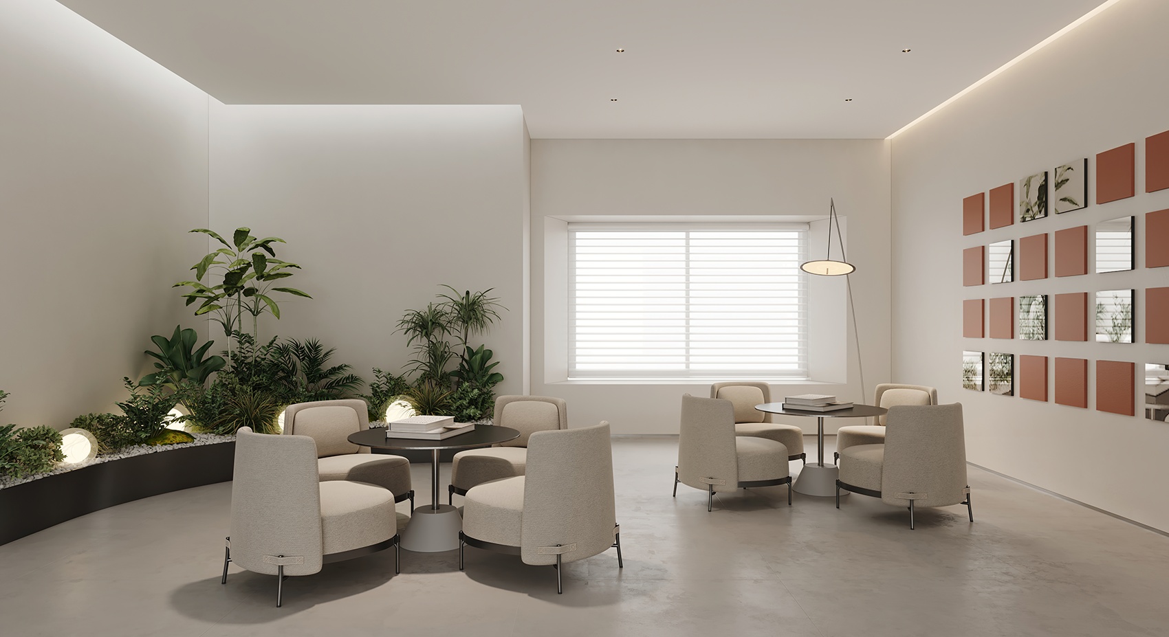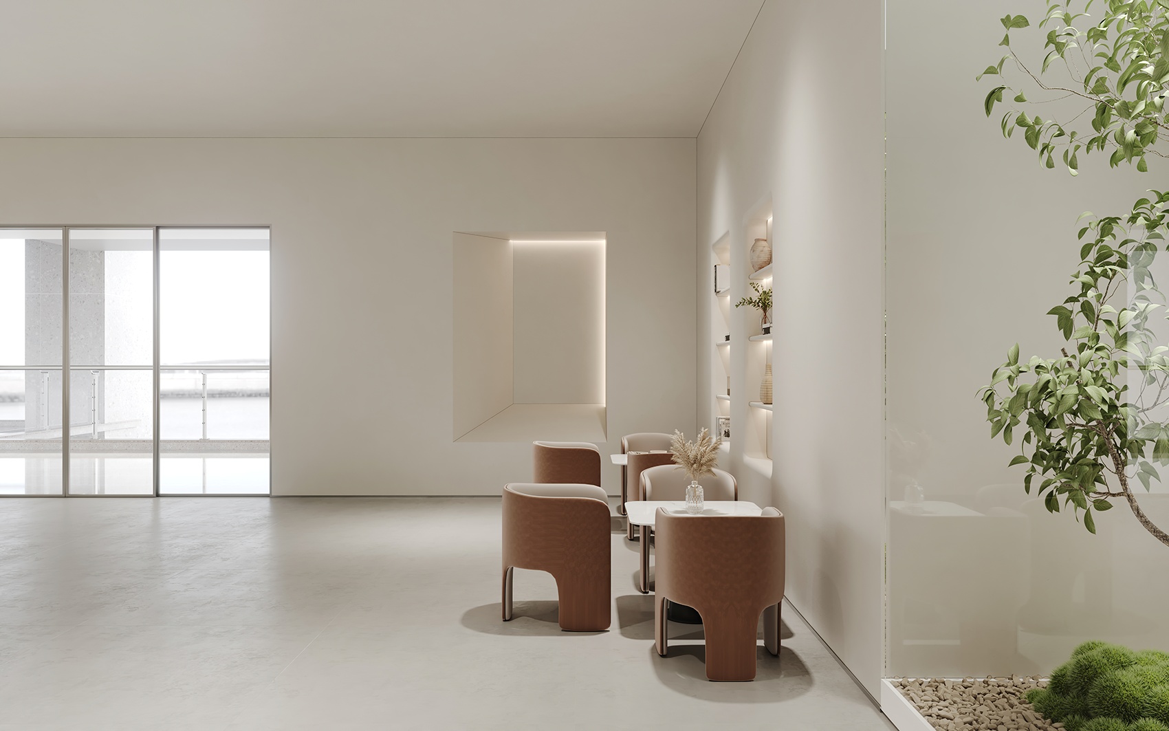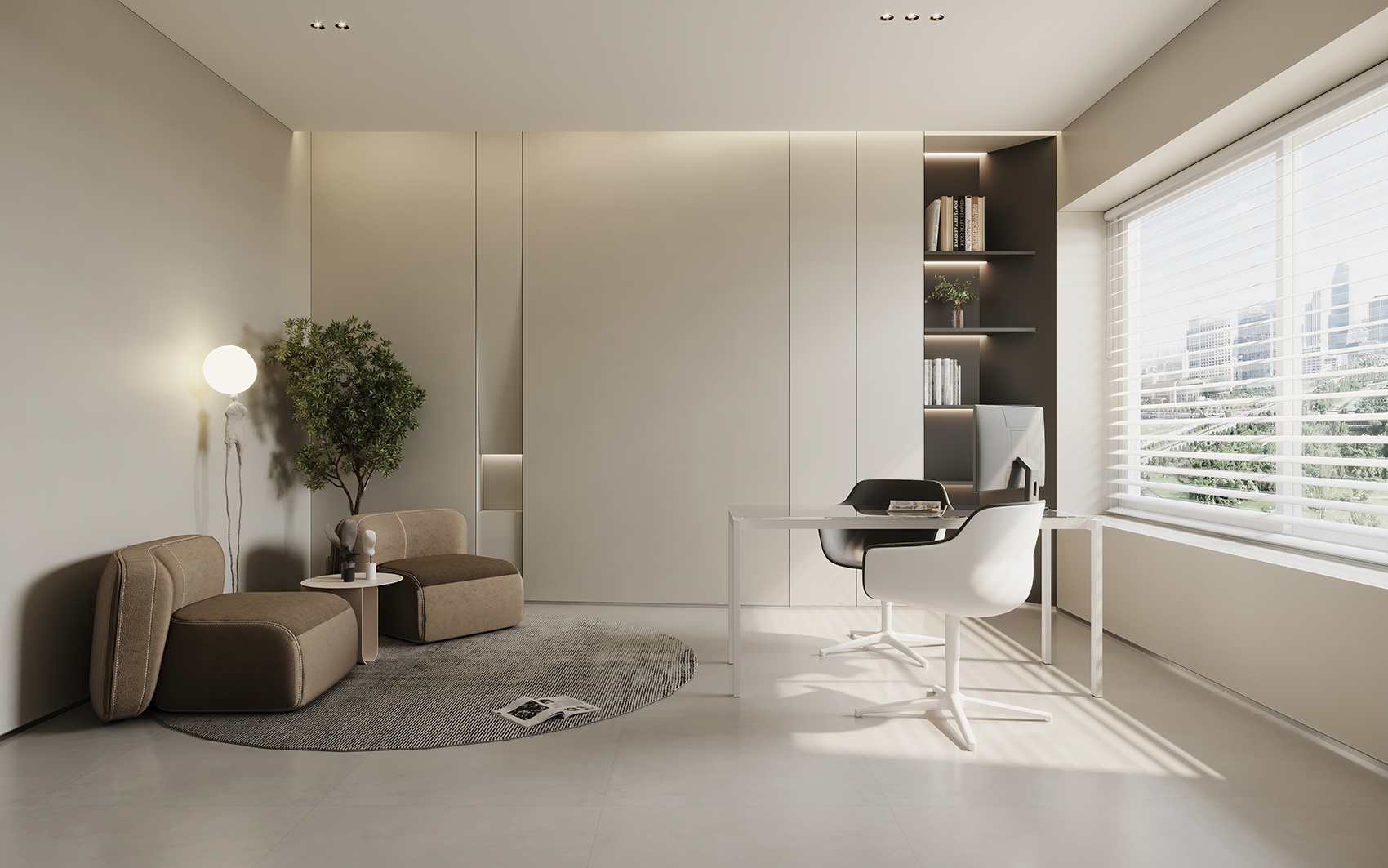 设计理念:空间以中性色调为主,没有强冲击力的色彩,以代表安全冷静的白色作为基础用色,加入知性的米灰色柔和空间,呈现出亲和舒适的质感。同时选用粉棕色来提亮空间,丰富视觉上的变化,从而使空间变得更有张力。