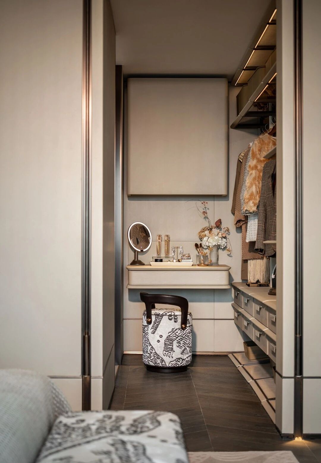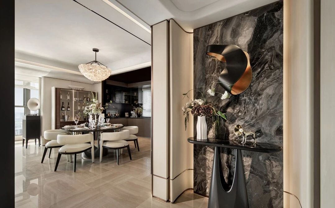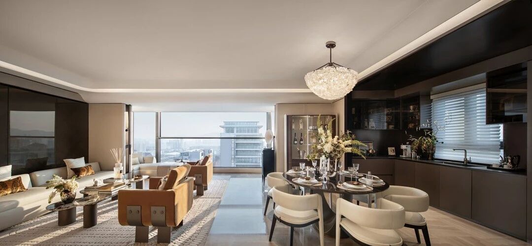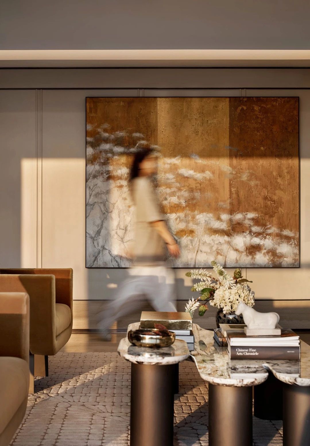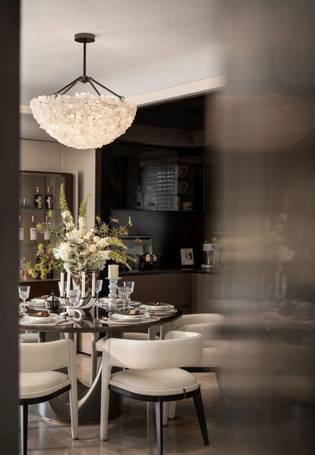 设计理念:设计师采用疏密得体的纹理打造相互克制的虚实节奏主题,仔细的呈现日常蓝图,配合细美的编织肌理和艺术注脚等赋予生活一种艺术解构。运用纯粹大理石打造玄关区域,在灰色衬托中彰显迂回灵动 的肌理,由此形成内外联动的经典标志。以轻松的留白处理赋予大客厅独特的“待客 ”气息。结合乌托邦式的理想概念,赋予第三角度视感一种端庄仪式感,从而根据传统礼仪和规律,呈现相对开放的包容性。