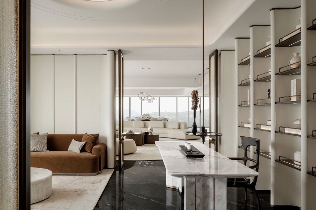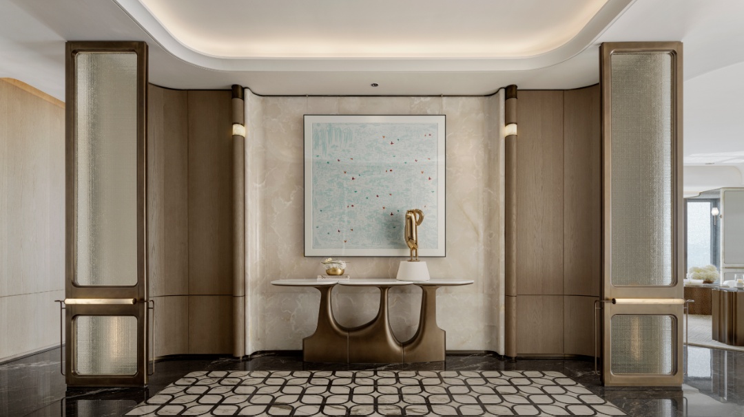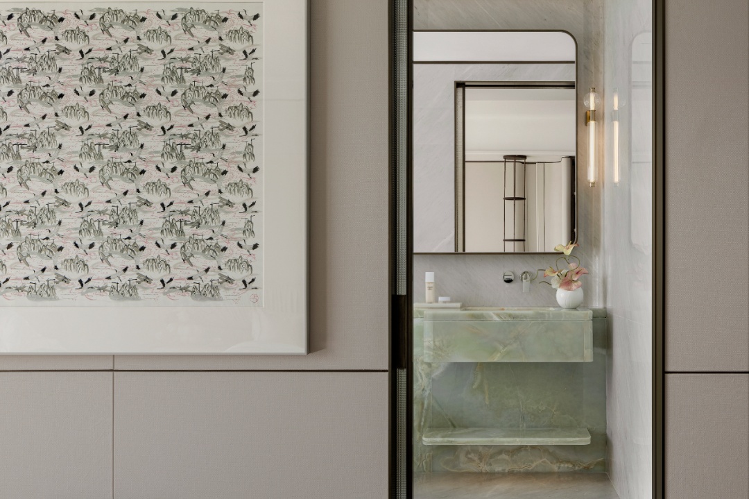 设计理念:玉石,作为这座空间的核心主题,为整个空间奠定了浅青色调的基调。设计师在色彩运用上极为克制,没有采用大面积的渲染,而是巧妙地借助原木色与各类玉质材质的搭配,如同精心调配的艺术调色板,将 “玉” 所特有的精致与剔透质感衬托得更加淋漓尽致。