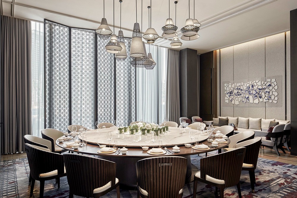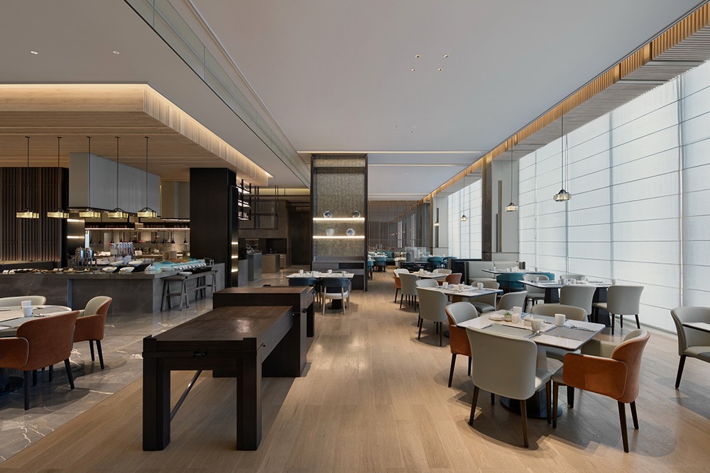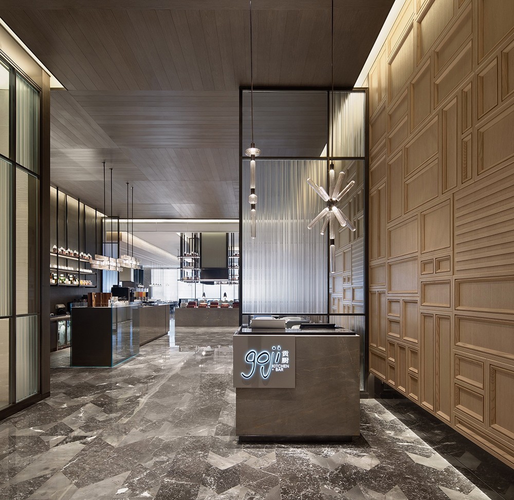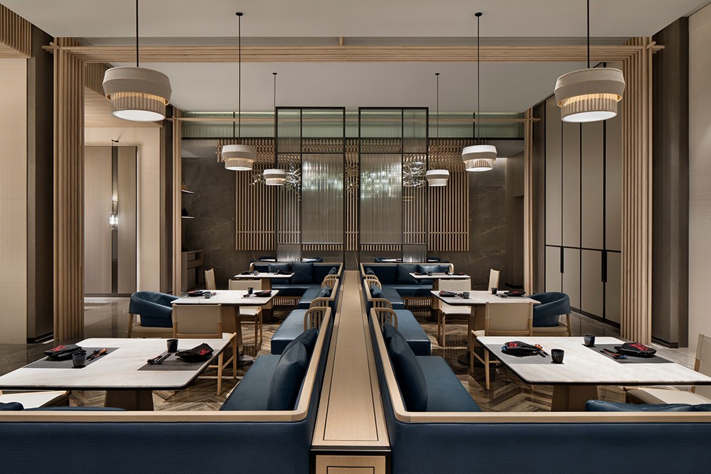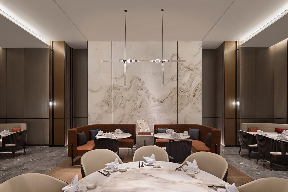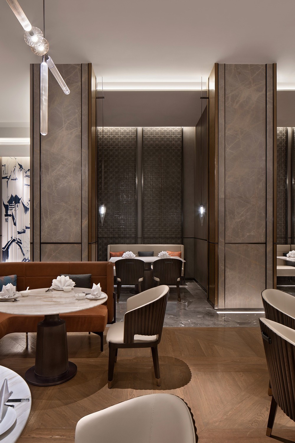 设计理念:从资源有效利用及后期运营出发,设计打通全日餐厅与特色餐厅边界,通过可分合的空间结构,灵活调节不同时段用餐人流的变化。中餐厅以大理石、皮革、木材质的自然质感与纹理打底,塑造出从容优雅的空间力量,与大国匠者身上内敛朴实的气质不谋而合。墙体特意做的对称分缝,则直接让建筑工艺为空间做装饰。包房兼顾沉稳典雅气质,却又别具风味。跳跃的色彩增添了空间活力,由碎瓦拼接而成的墙面艺术装饰,则使人产生无限想象。阵列式设计语言延续至此,穿插结构的栅格屏风,取意建筑“脚手架”元素,致敬每一个伟大创意的落地。