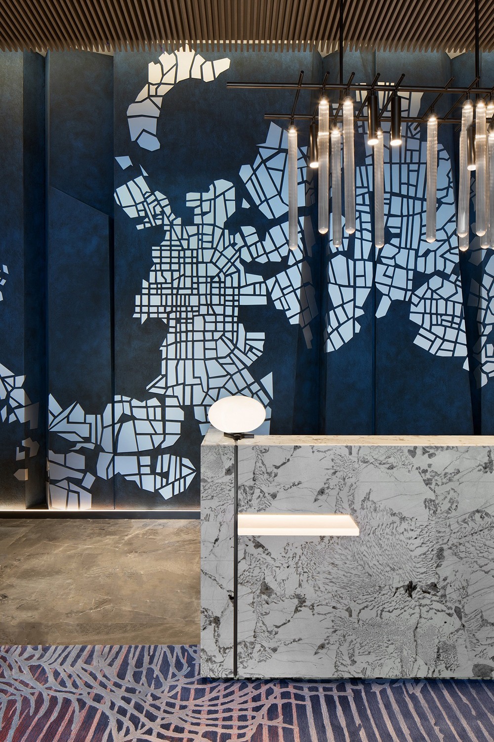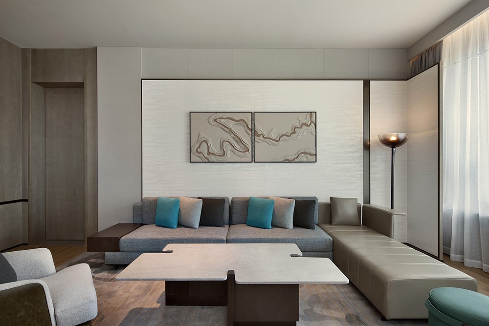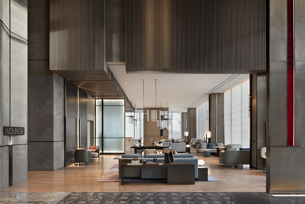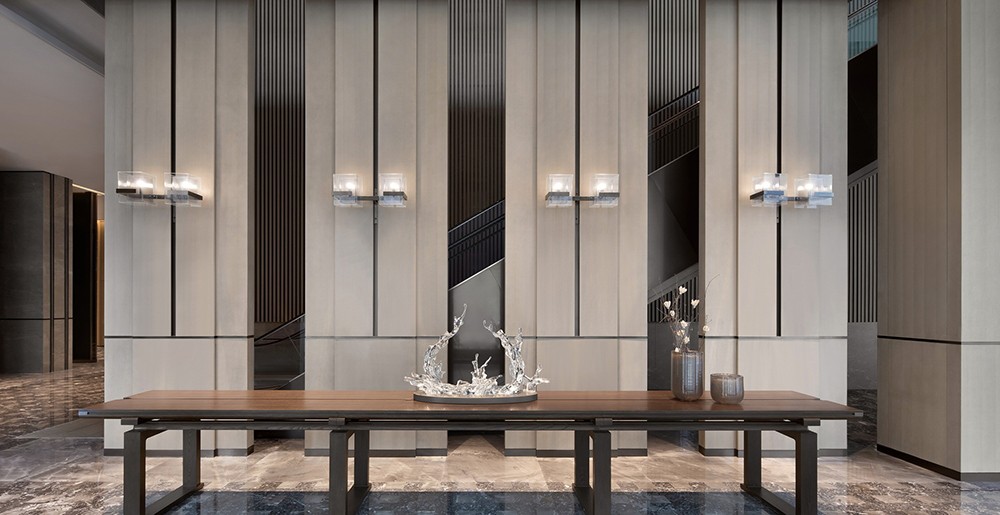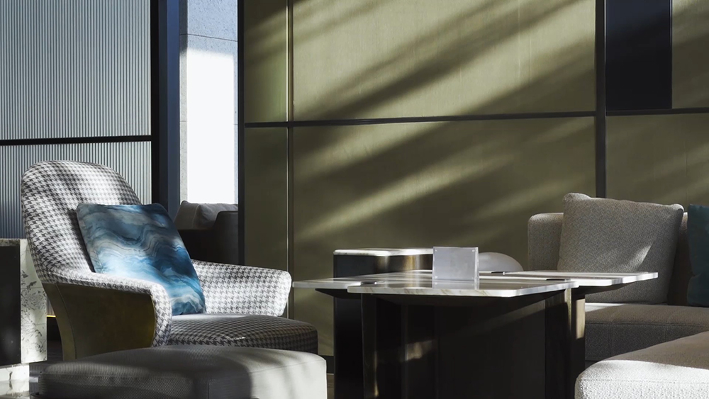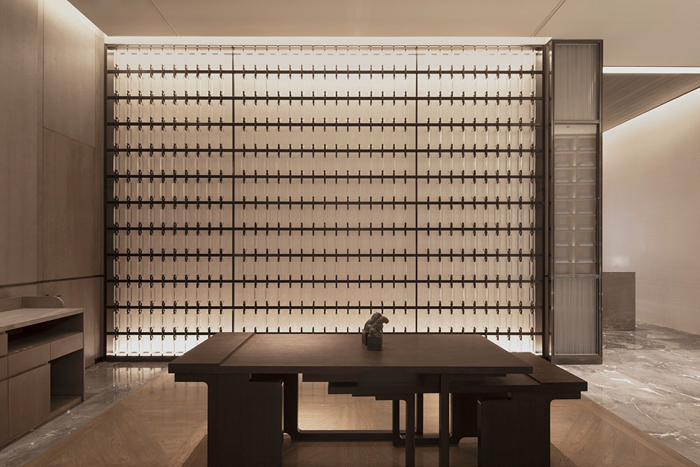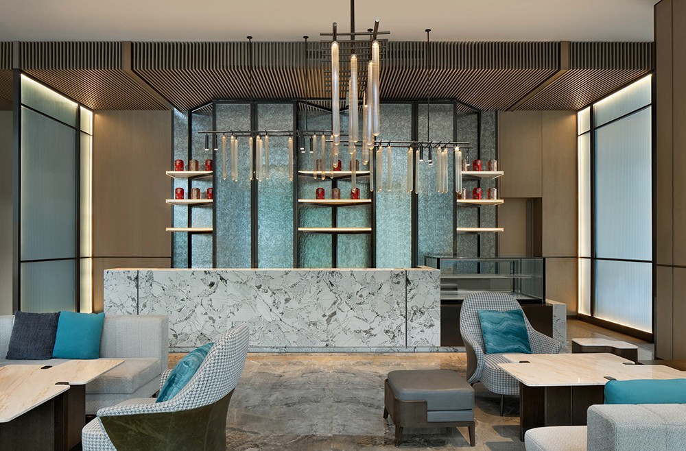 设计理念:从资源有效利用及后期运营出发,设计打通全日餐厅与特色餐厅边界,通过可分合的空间结构,灵活调节不同时段用餐人流的变化。中餐厅以大理石、皮革、木材质的自然质感与纹理打底,塑造出从容优雅的空间力量,与大国匠者身上内敛朴实的气质不谋而合。墙体特意做的对称分缝,则直接让建筑工艺为空间做装饰。包房兼顾沉稳典雅气质,却又别具风味。跳跃的色彩增添了空间活力,由碎瓦拼接而成的墙面艺术装饰,则使人产生无限想象。阵列式设计语言延续至此,穿插结构的栅格屏风,取意建筑“脚手架”元素,致敬每一个伟大创意的落地。