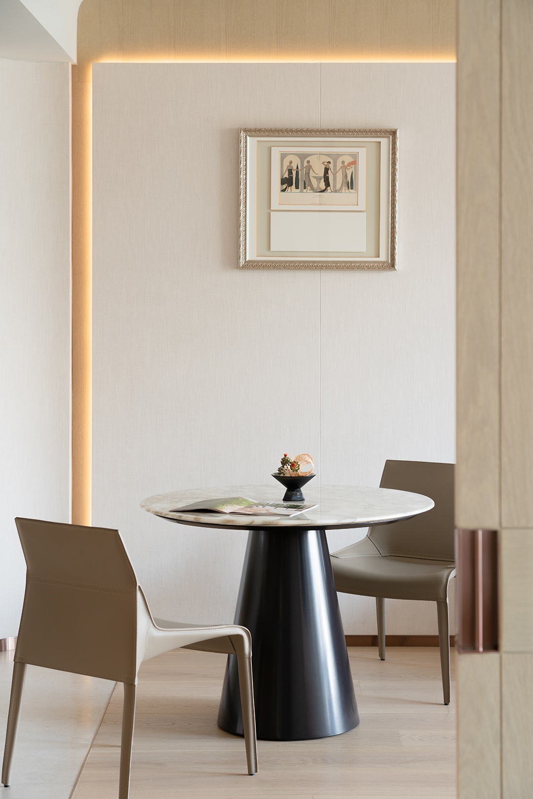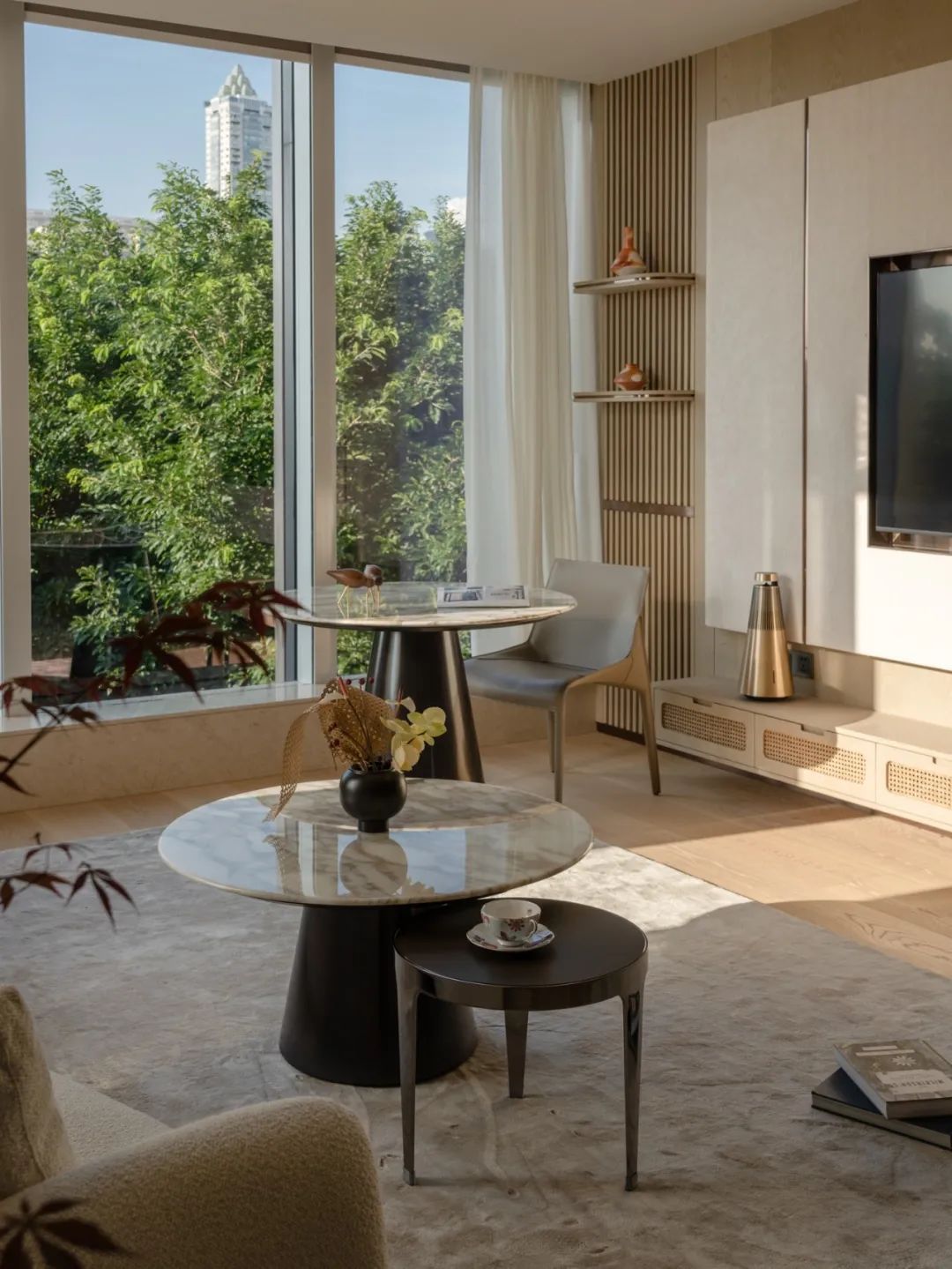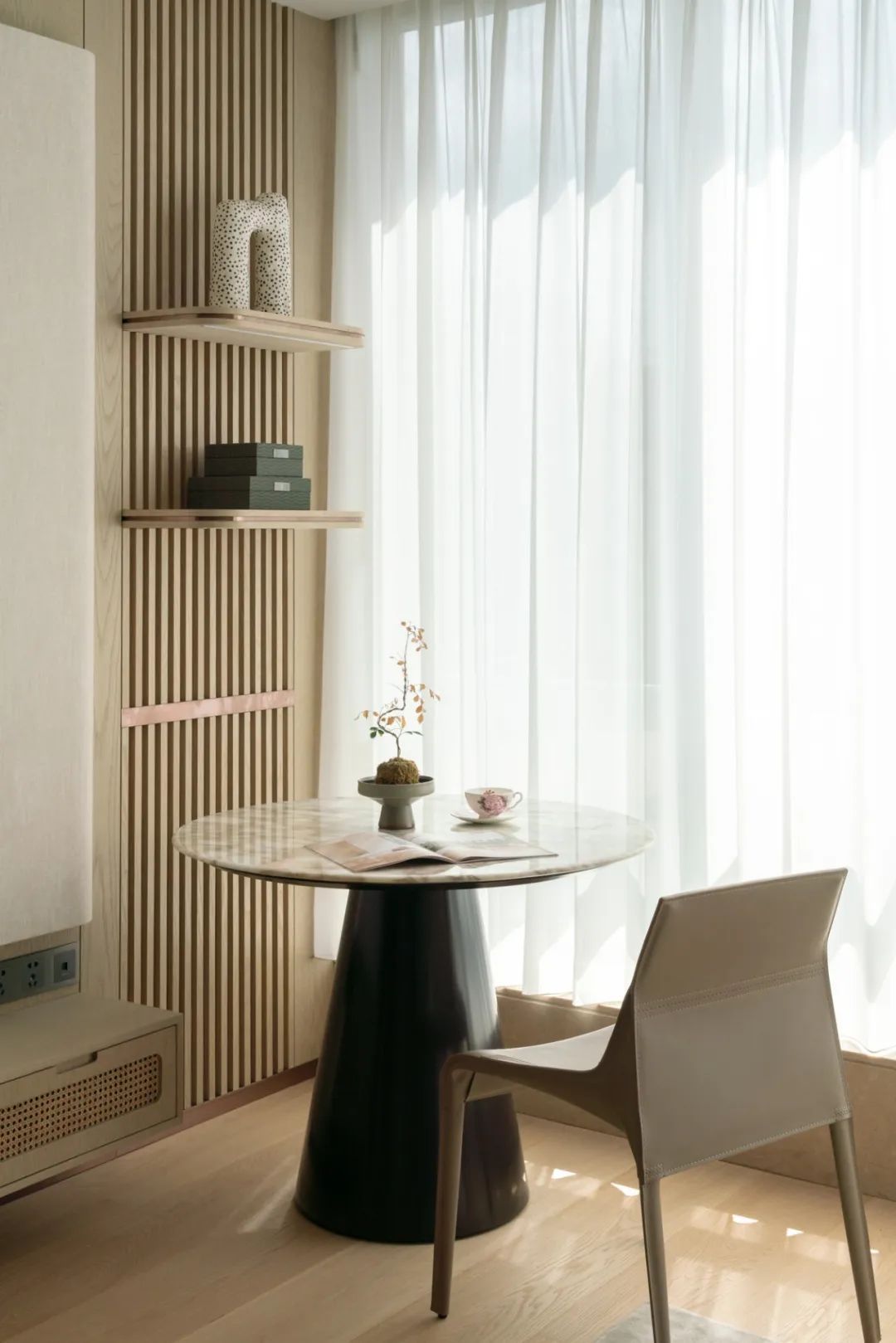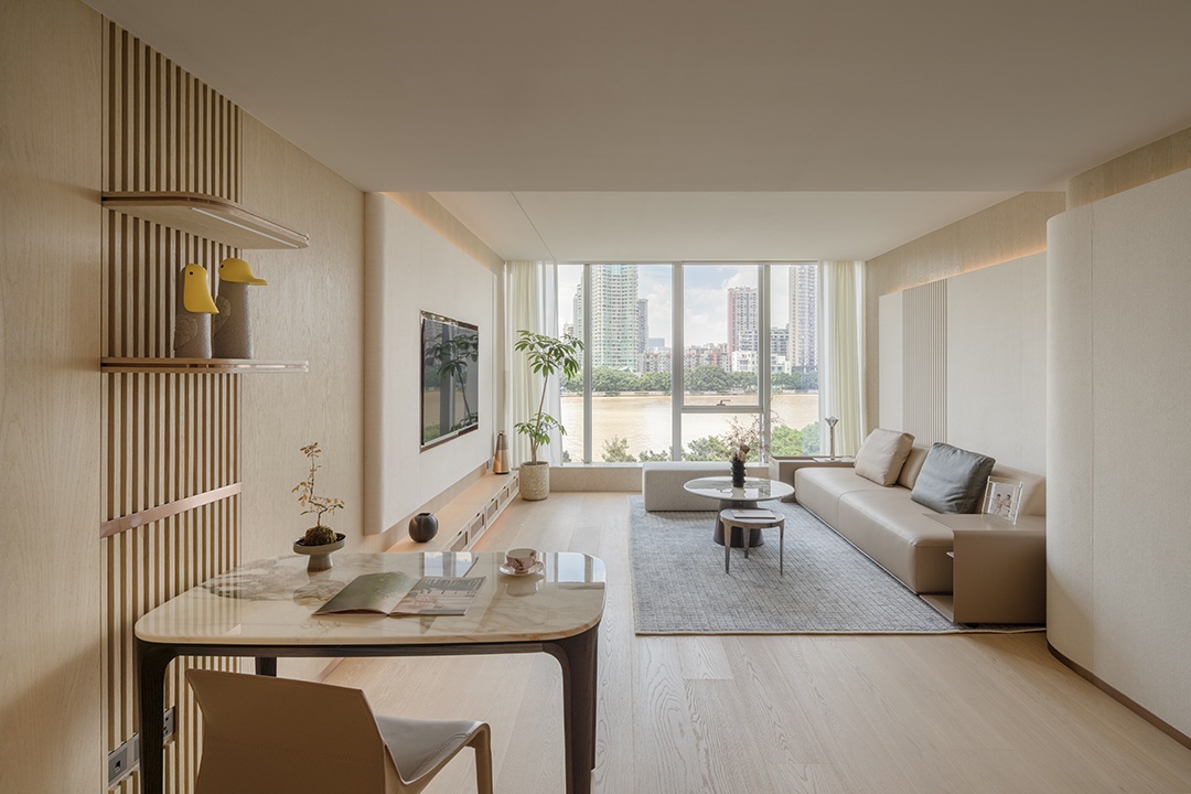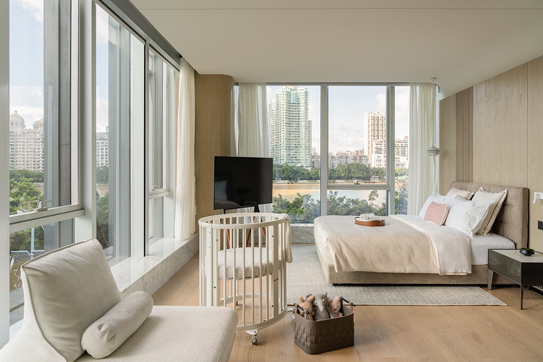设计理念:遵循探索空间更多可能性的原则,从建筑、景观再到室内,尊重自然环境,并尝试将二沙岛这独特可贵的自然景色引入室内,让生活居所离自然更进一步,感受纯粹的身心放松和疗愈方式。大落地玻璃窗将外部的自然风景打开并化呈现,这是再多的人工配饰也无法比拟的。绿色代表着孕育生命与希望,带来平静的情绪,创造放松的基调,十分适合拥有新生儿和新生活的温暖新家。