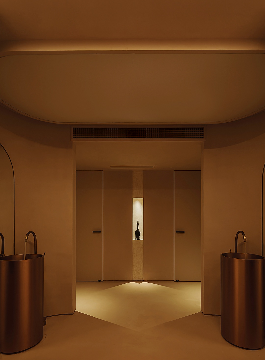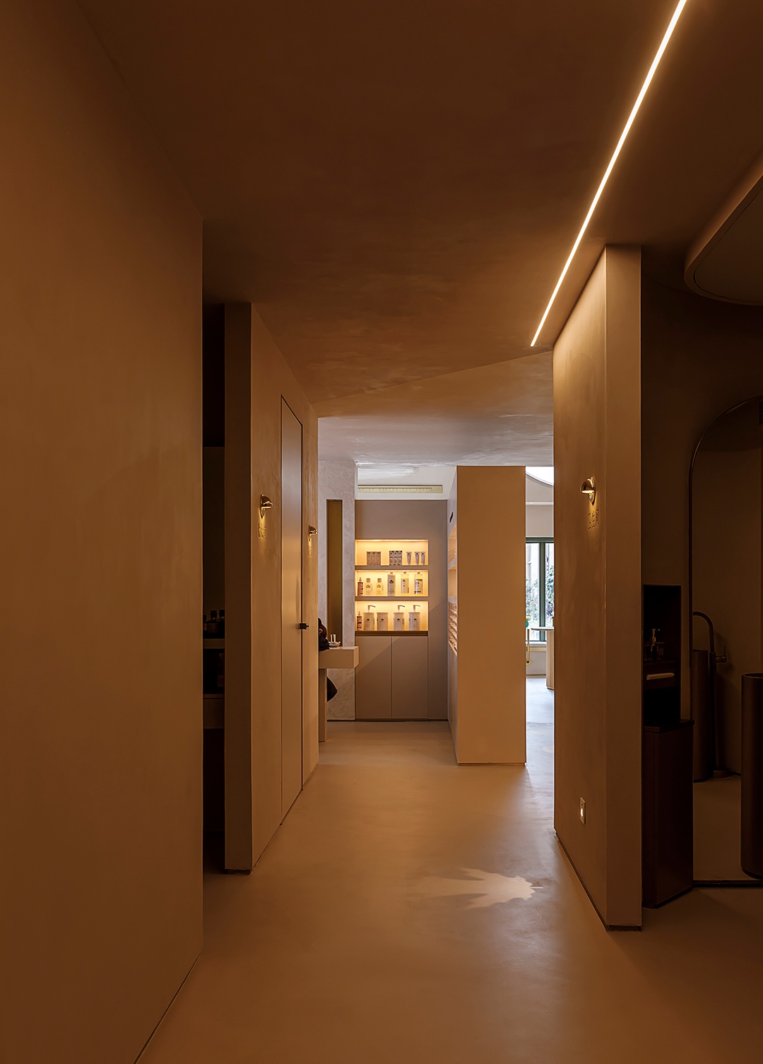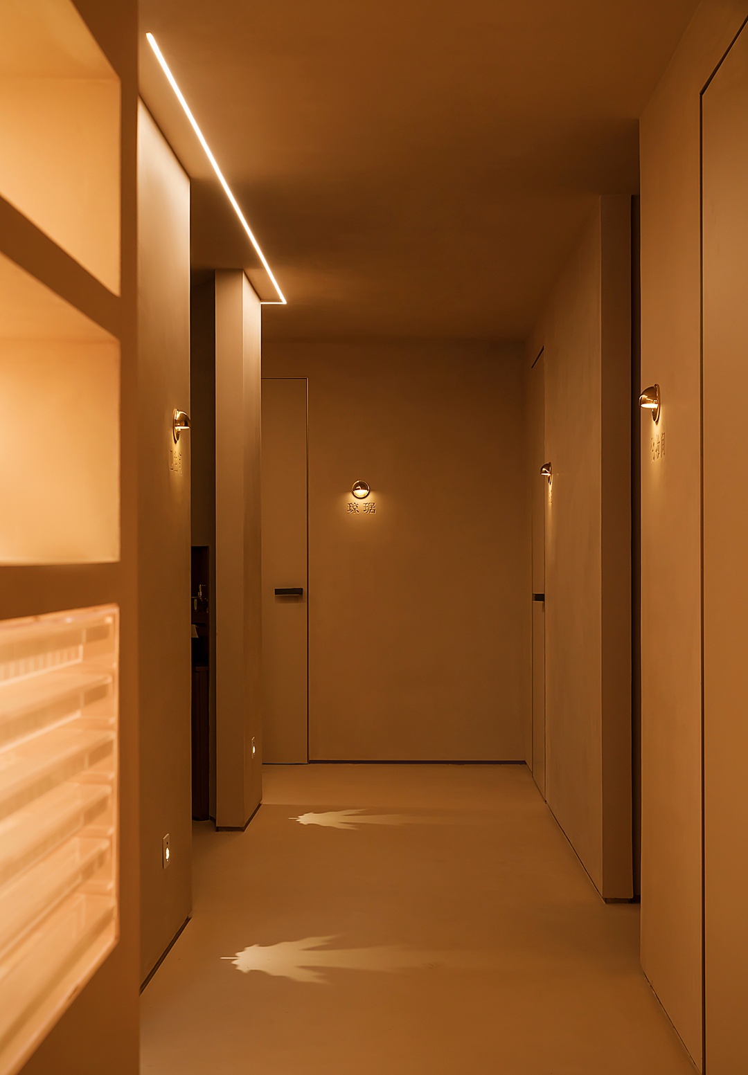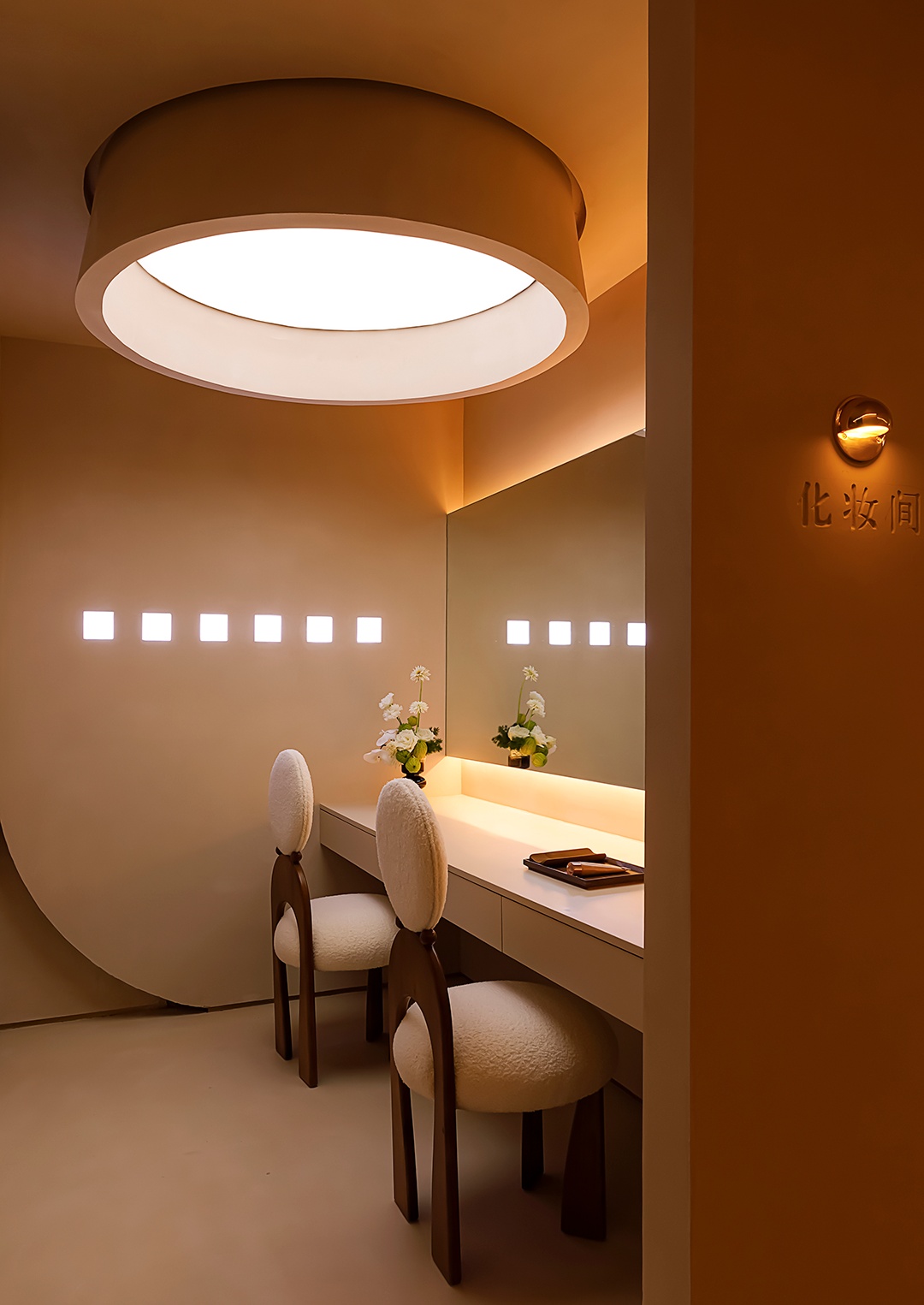 设计理念:避开梁位,实现层高最大化。为使空间利用率最大化,又保留空间的纵深感,接待区采用了挑空的处理形式。采用趋势向里的大弧度造型,让眼睛禁不住向里窥探。简洁的线条,同色的墙顶和地面,将空间留白。为了在空间里增加生命力,运用灯光的变换,将小空间做大,使顾客身处其中时,能够舒缓地、细致入微地去体验服务。