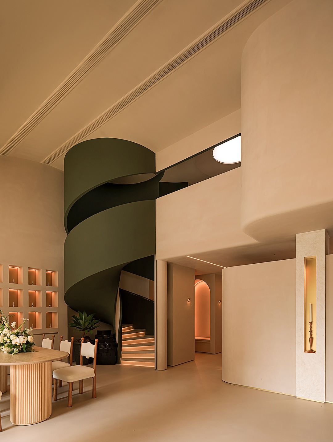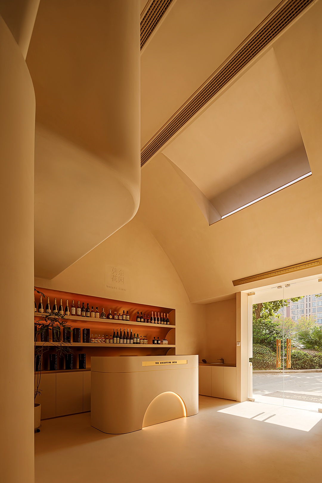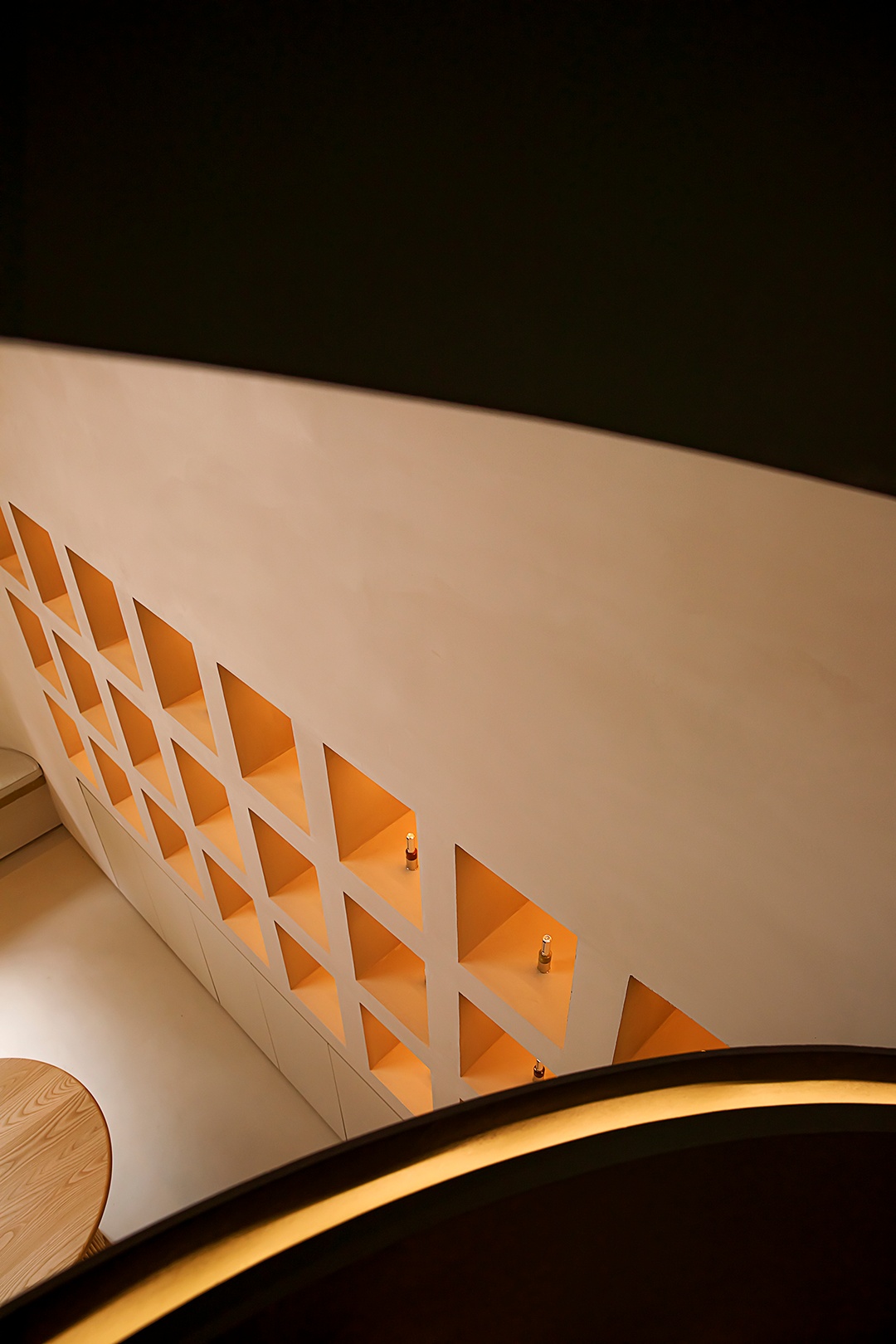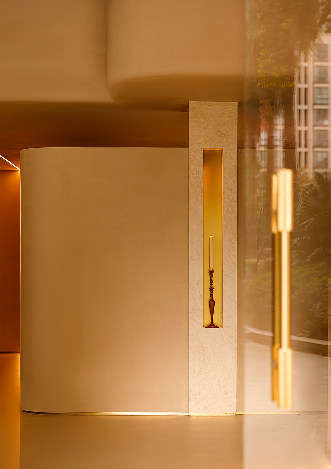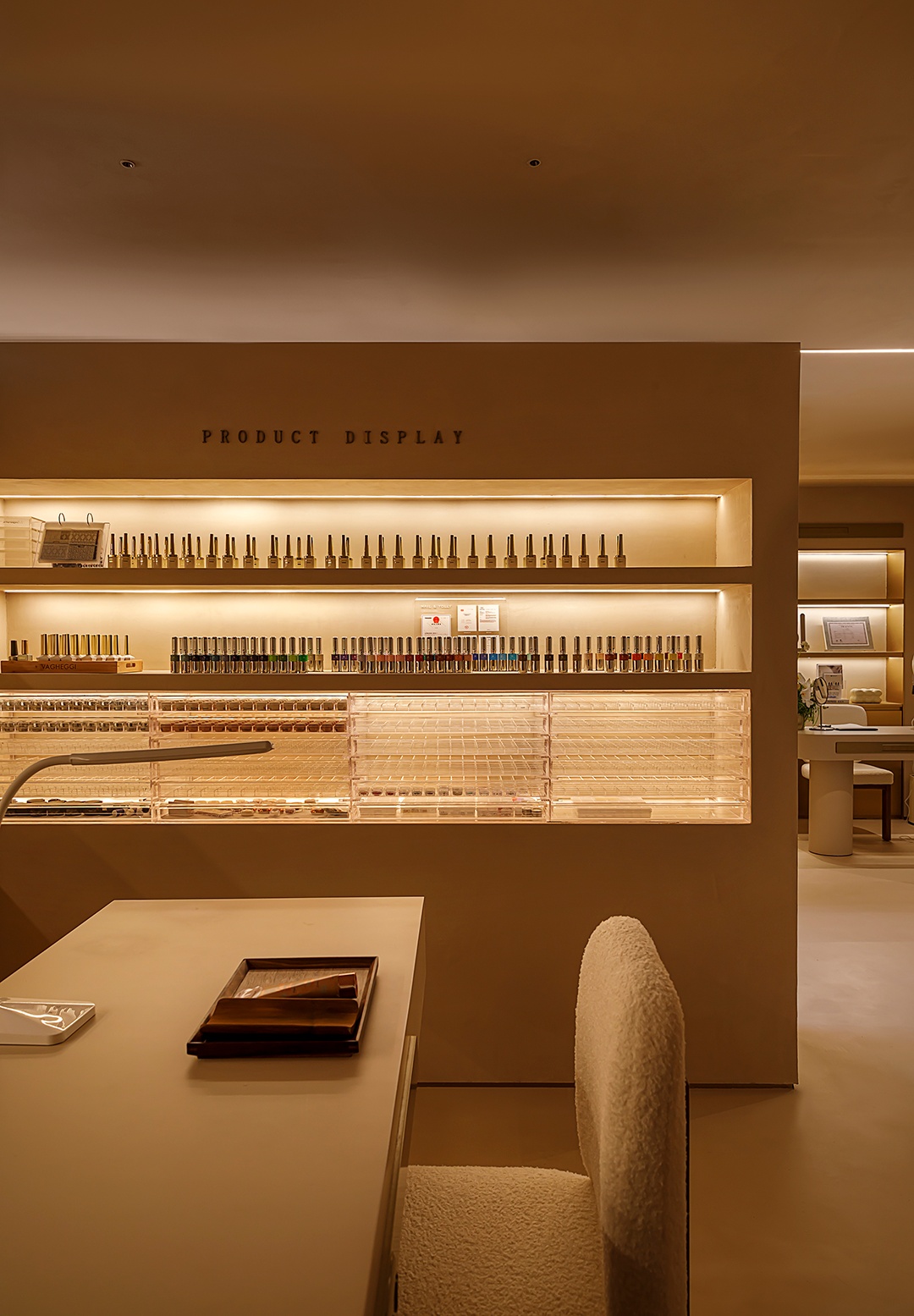 设计理念:避开梁位,实现层高最大化。为使空间利用率最大化,又保留空间的纵深感,接待区采用了挑空的处理形式。采用趋势向里的大弧度造型,让眼睛禁不住向里窥探。简洁的线条,同色的墙顶和地面,将空间留白。为了在空间里增加生命力,运用灯光的变换,将小空间做大,使顾客身处其中时,能够舒缓地、细致入微地去体验服务。