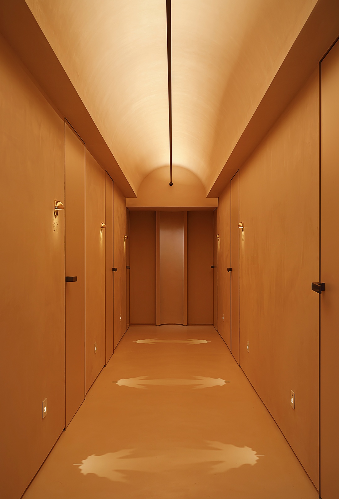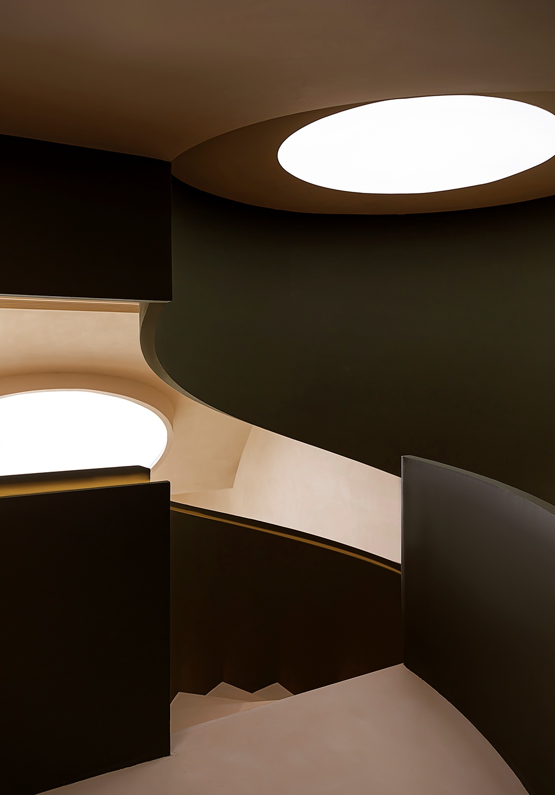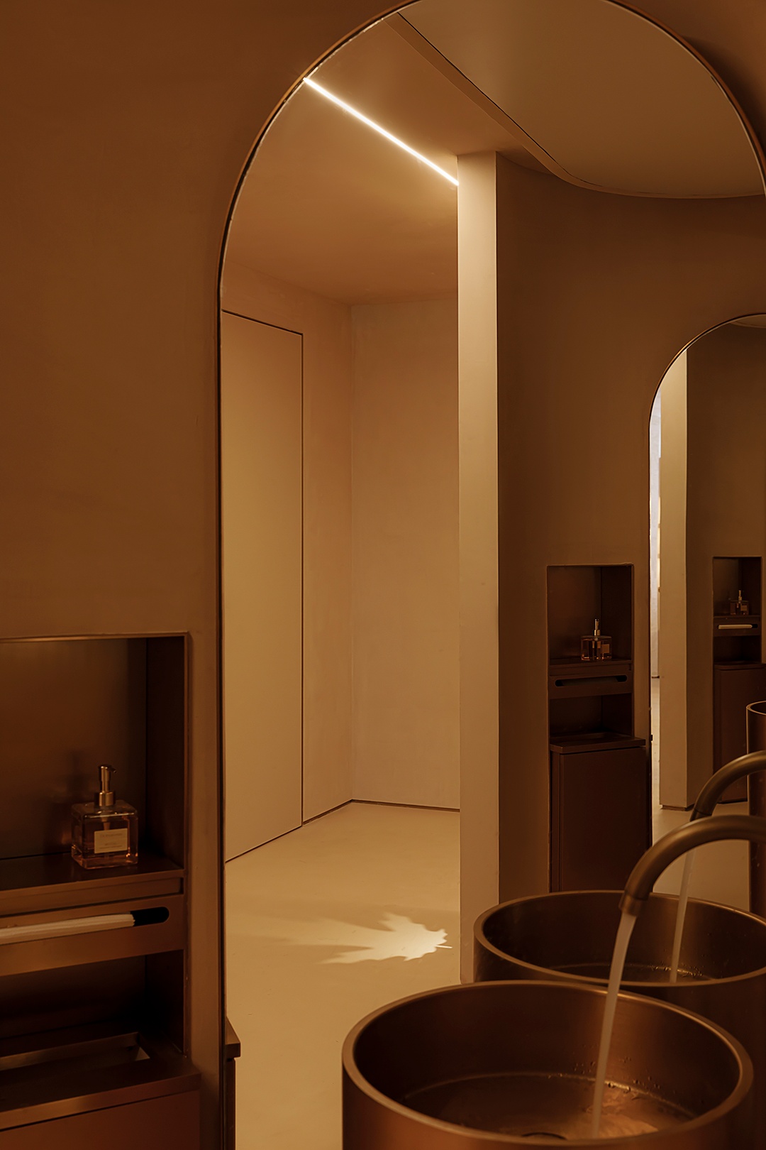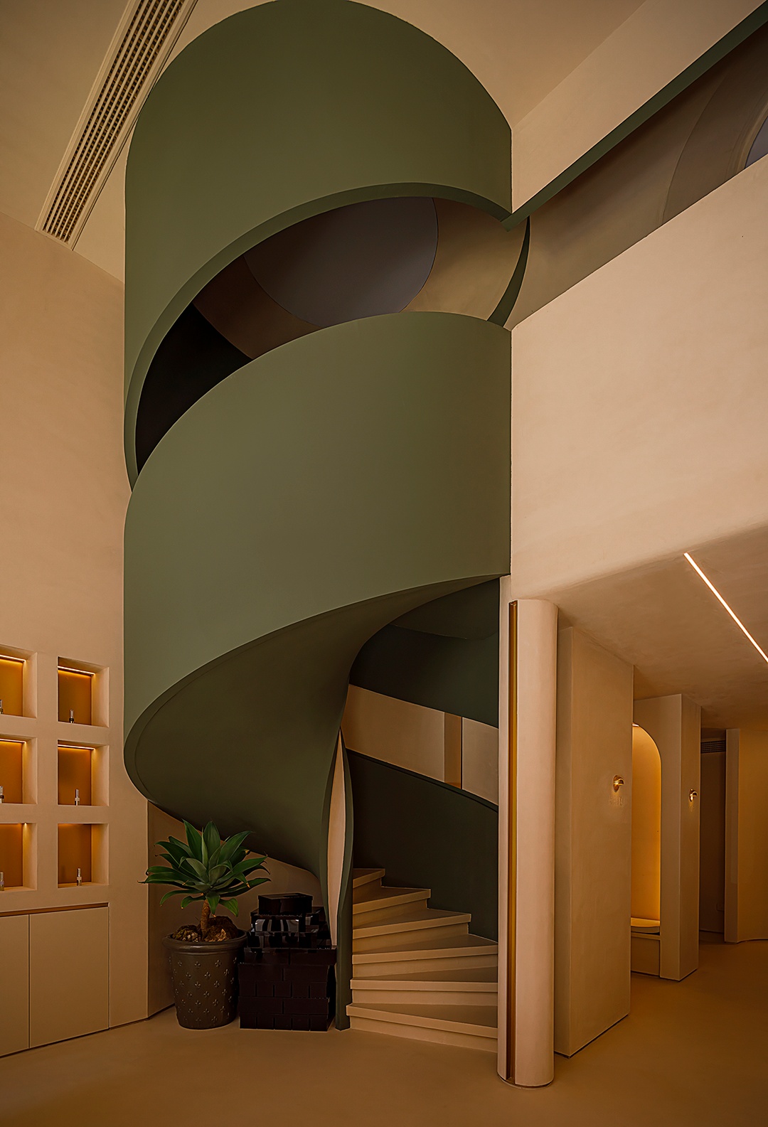 设计理念:避开梁位,实现层高最大化。为使空间利用率最大化,又保留空间的纵深感,接待区采用了挑空的处理形式。采用趋势向里的大弧度造型,让眼睛禁不住向里窥探。简洁的线条,同色的墙顶和地面,将空间留白。为了在空间里增加生命力,运用灯光的变换,将小空间做大,使顾客身处其中时,能够舒缓地、细致入微地去体验服务。