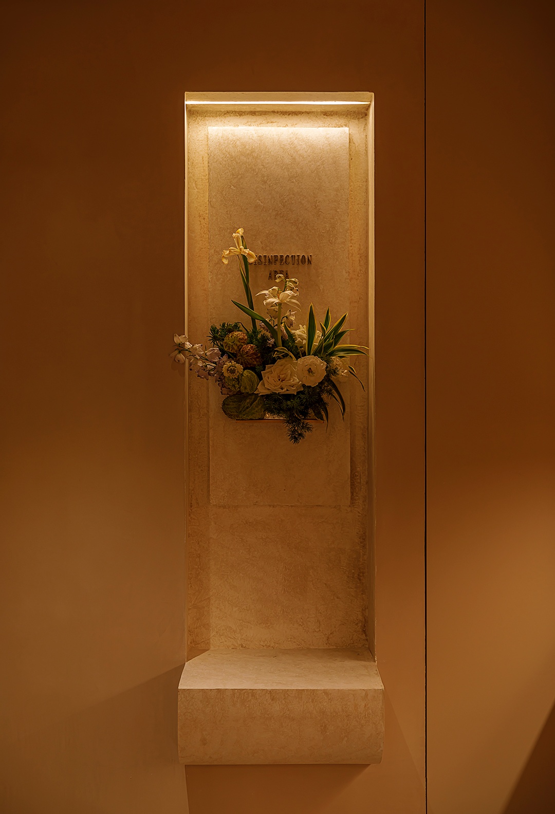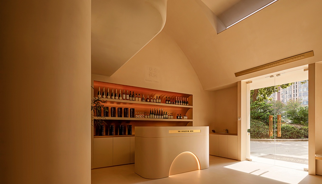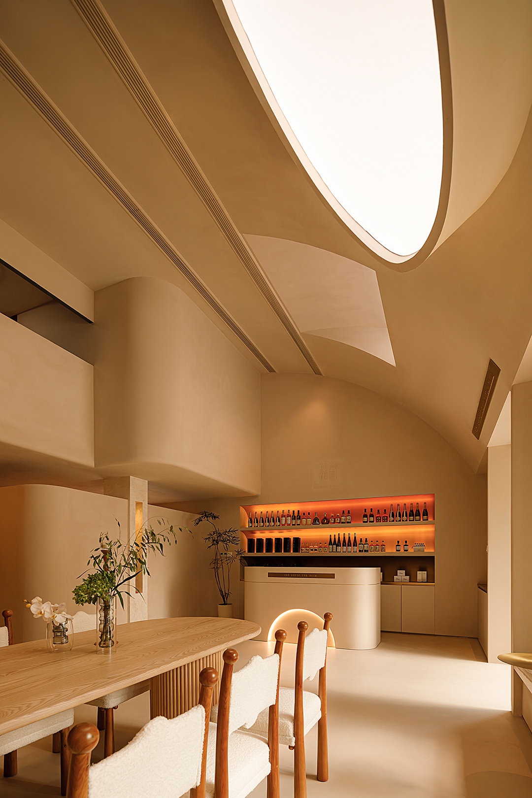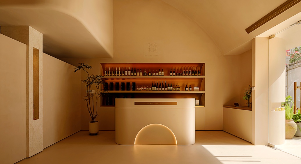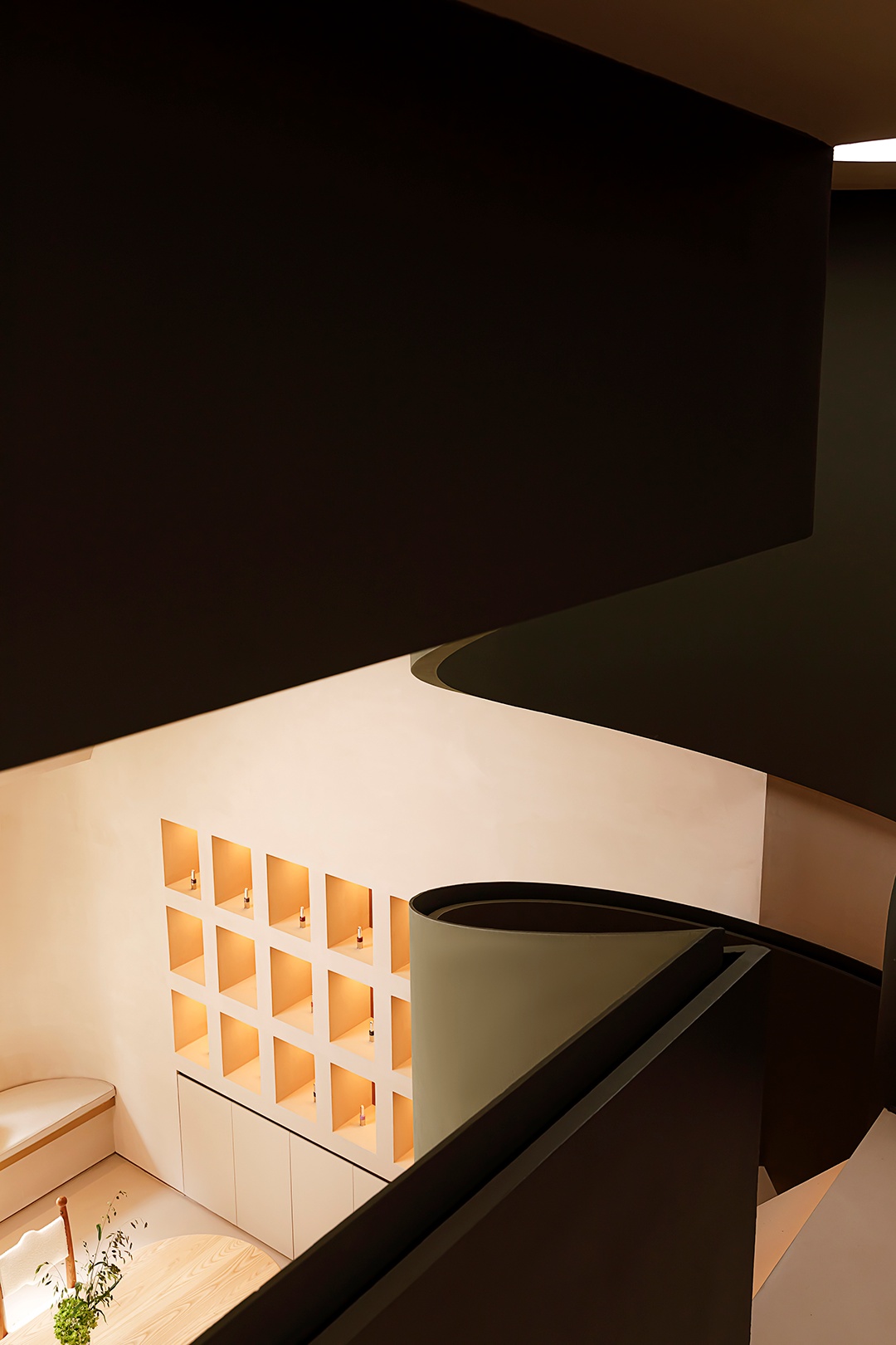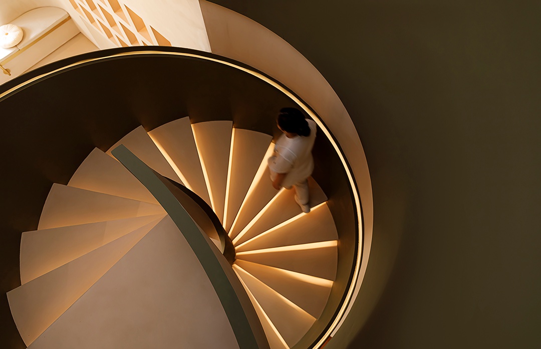 设计理念:避开梁位,实现层高最大化。为使空间利用率最大化,又保留空间的纵深感,接待区采用了挑空的处理形式。采用趋势向里的大弧度造型,让眼睛禁不住向里窥探。简洁的线条,同色的墙顶和地面,将空间留白。为了在空间里增加生命力,运用灯光的变换,将小空间做大,使顾客身处其中时,能够舒缓地、细致入微地去体验服务。