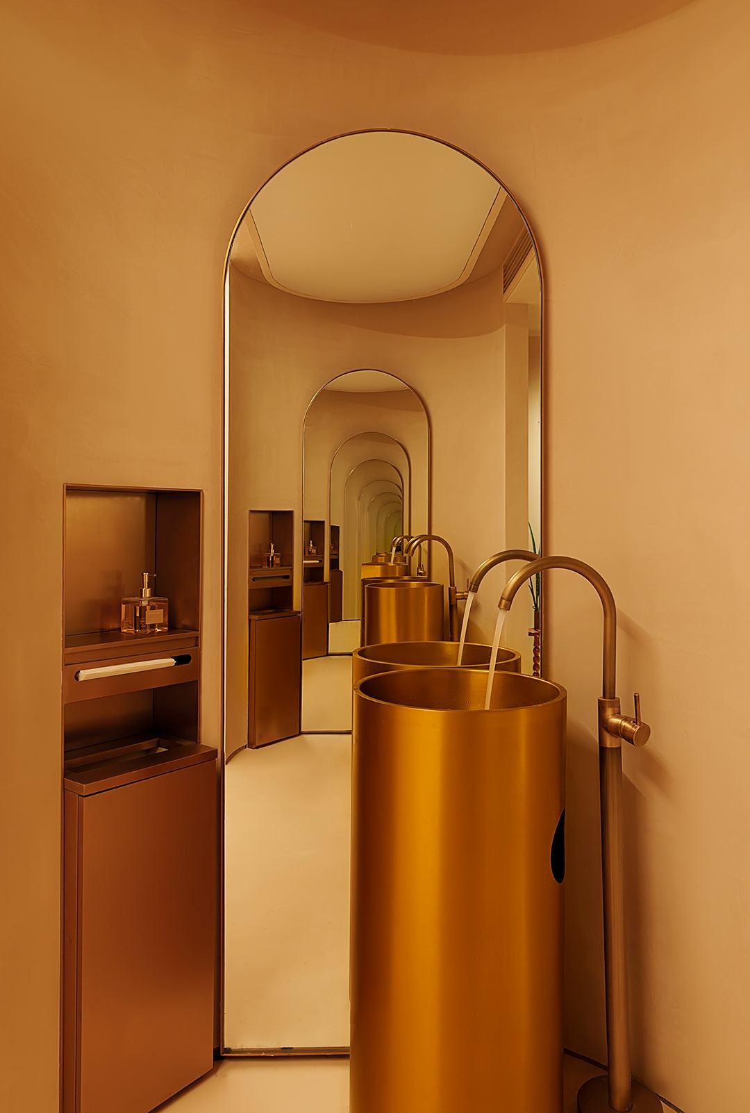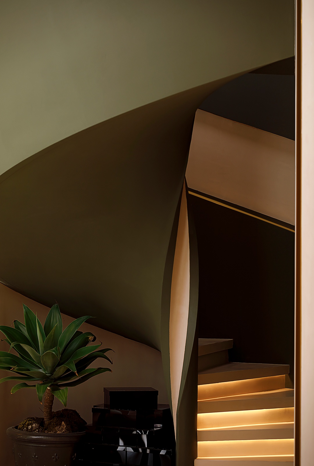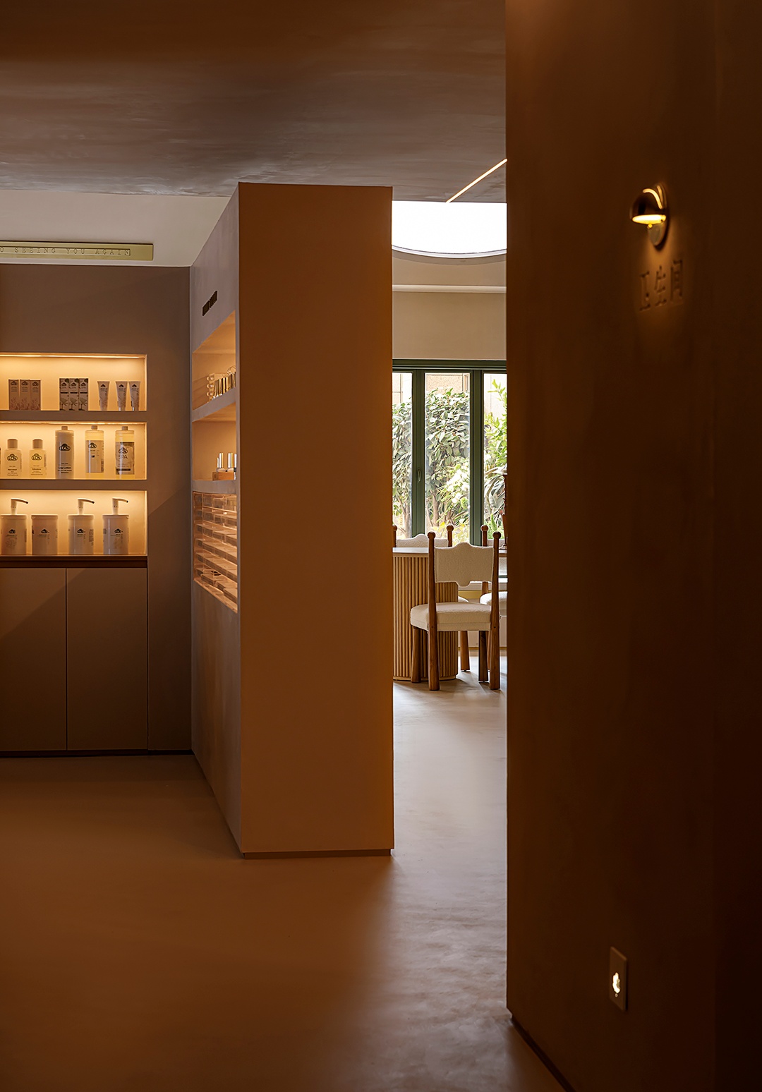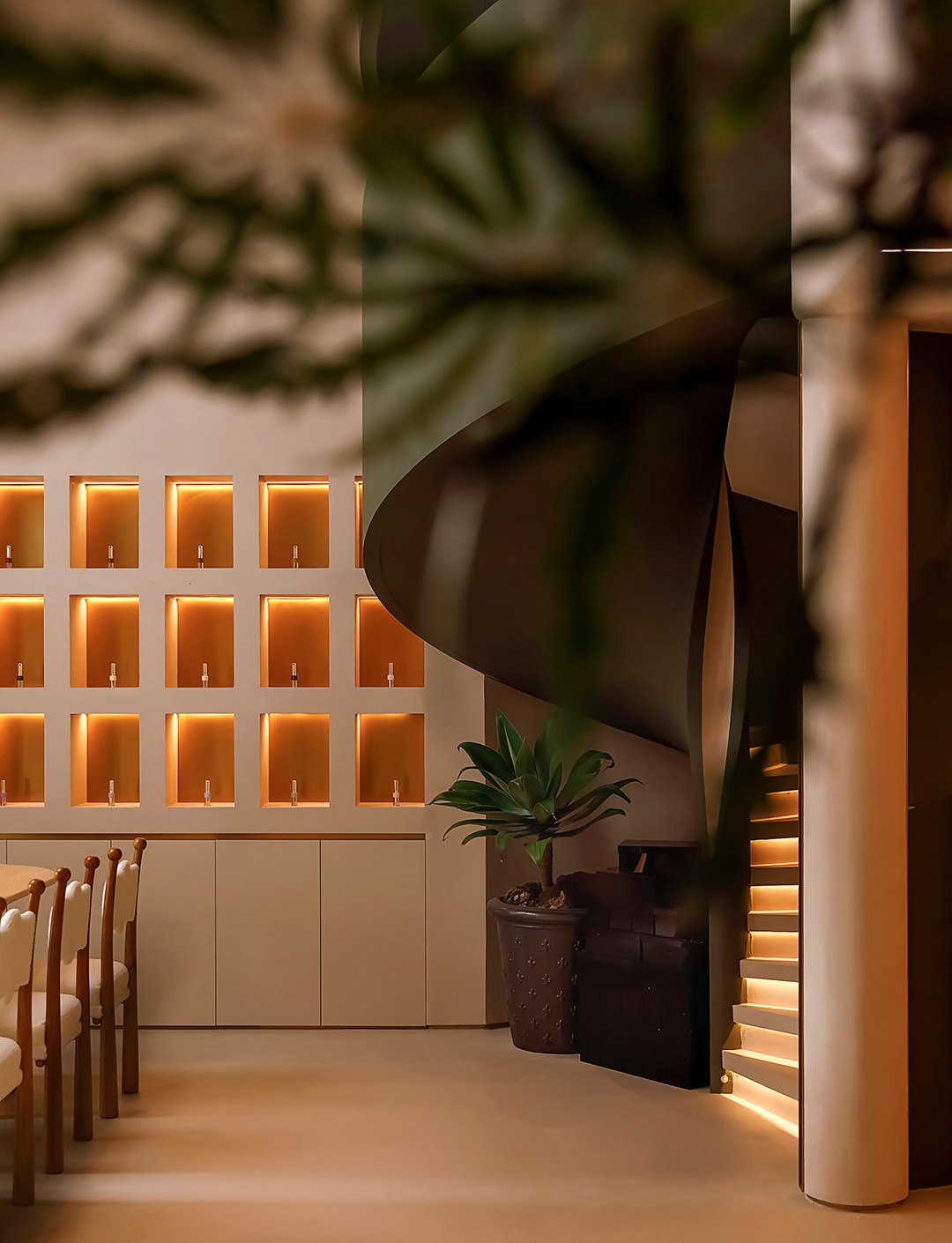 设计理念:避开梁位,实现层高最大化。为使空间利用率最大化,又保留空间的纵深感,接待区采用了挑空的处理形式。采用趋势向里的大弧度造型,让眼睛禁不住向里窥探。简洁的线条,同色的墙顶和地面,将空间留白。为了在空间里增加生命力,运用灯光的变换,将小空间做大,使顾客身处其中时,能够舒缓地、细致入微地去体验服务。