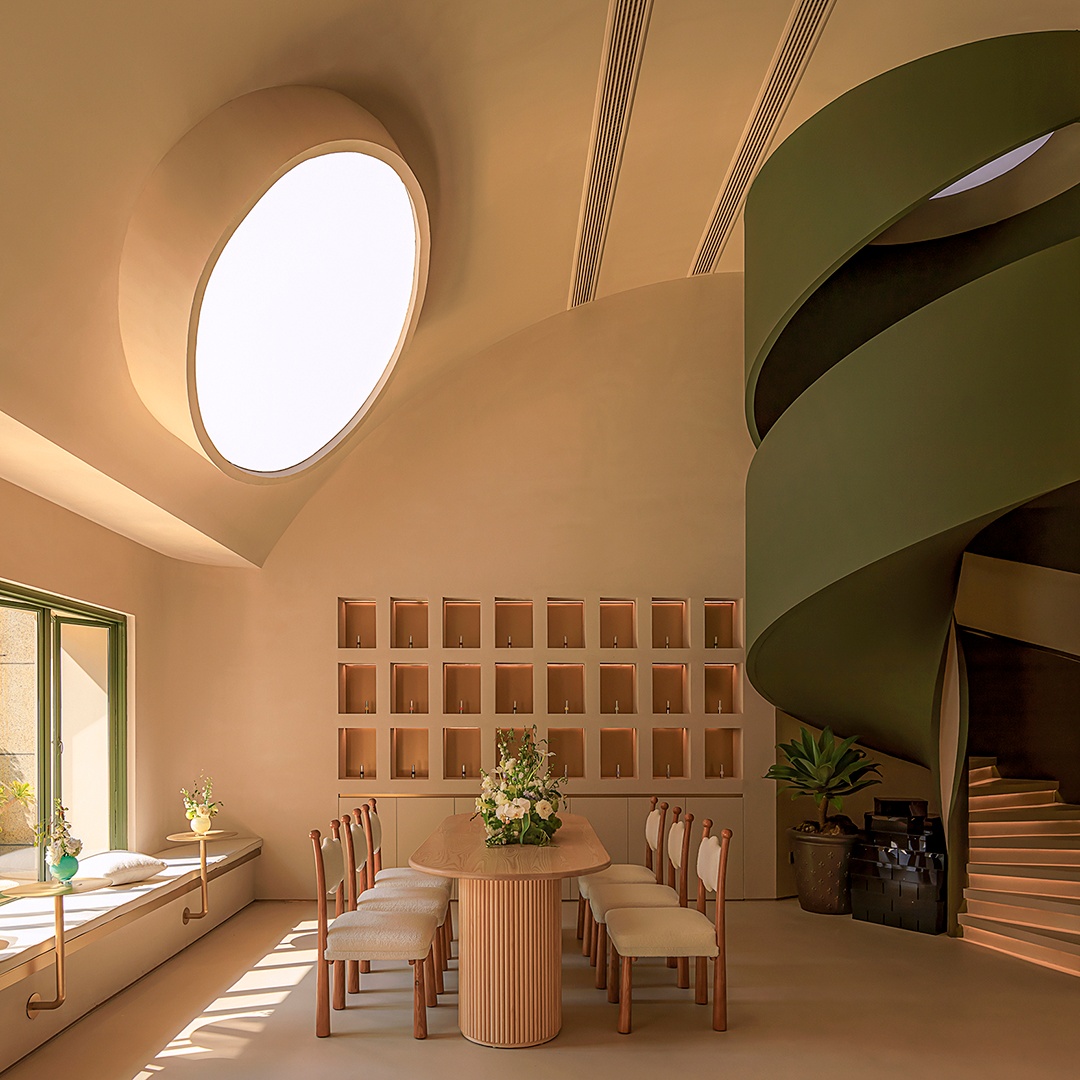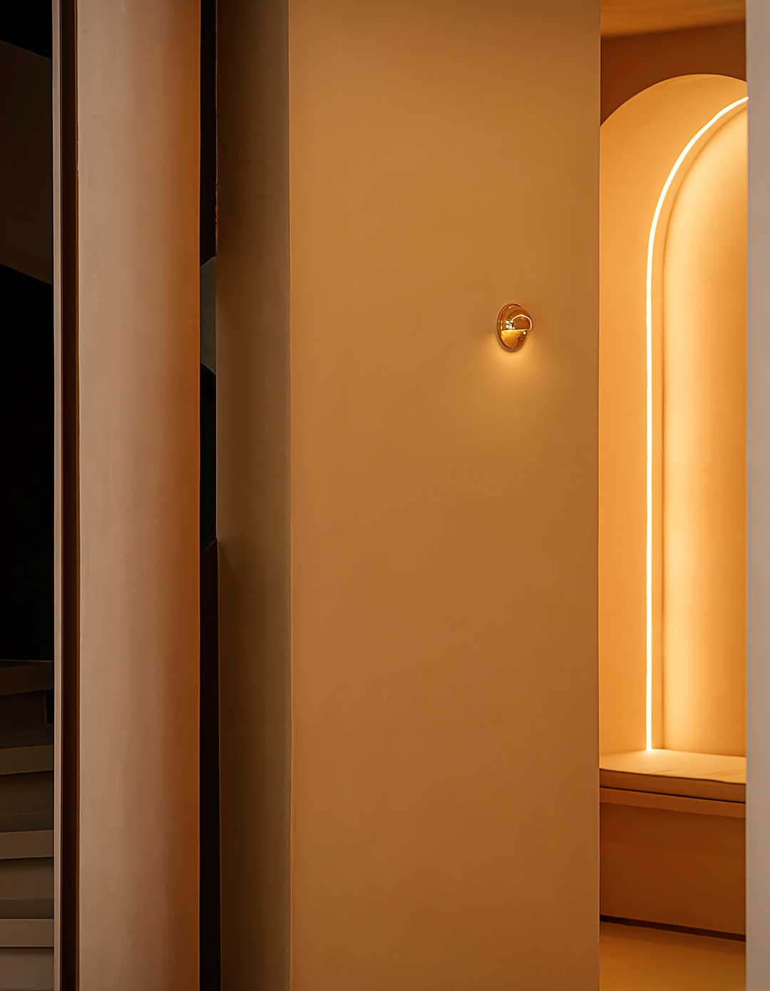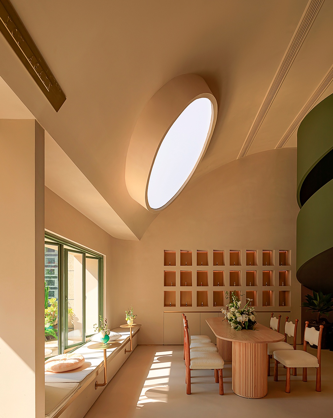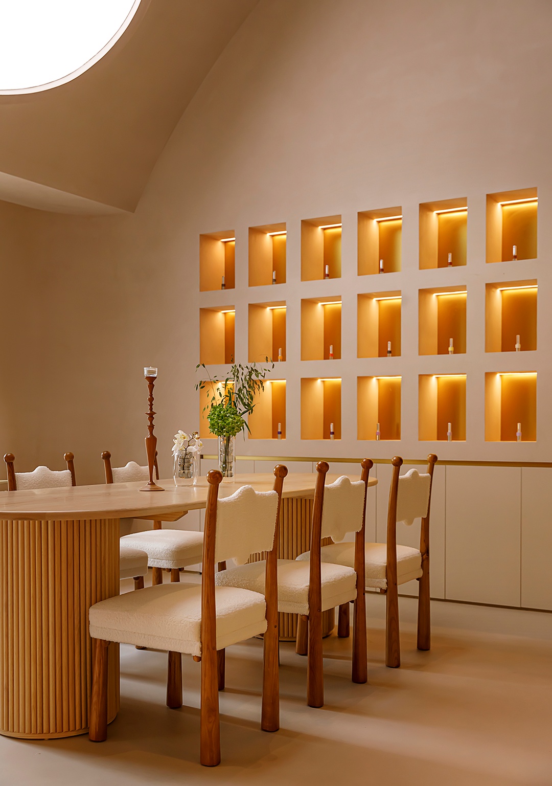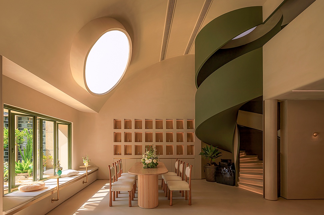 设计理念:避开梁位,实现层高最大化。为使空间利用率最大化,又保留空间的纵深感,接待区采用了挑空的处理形式。采用趋势向里的大弧度造型,让眼睛禁不住向里窥探。简洁的线条,同色的墙顶和地面,将空间留白。为了在空间里增加生命力,运用灯光的变换,将小空间做大,使顾客身处其中时,能够舒缓地、细致入微地去体验服务。